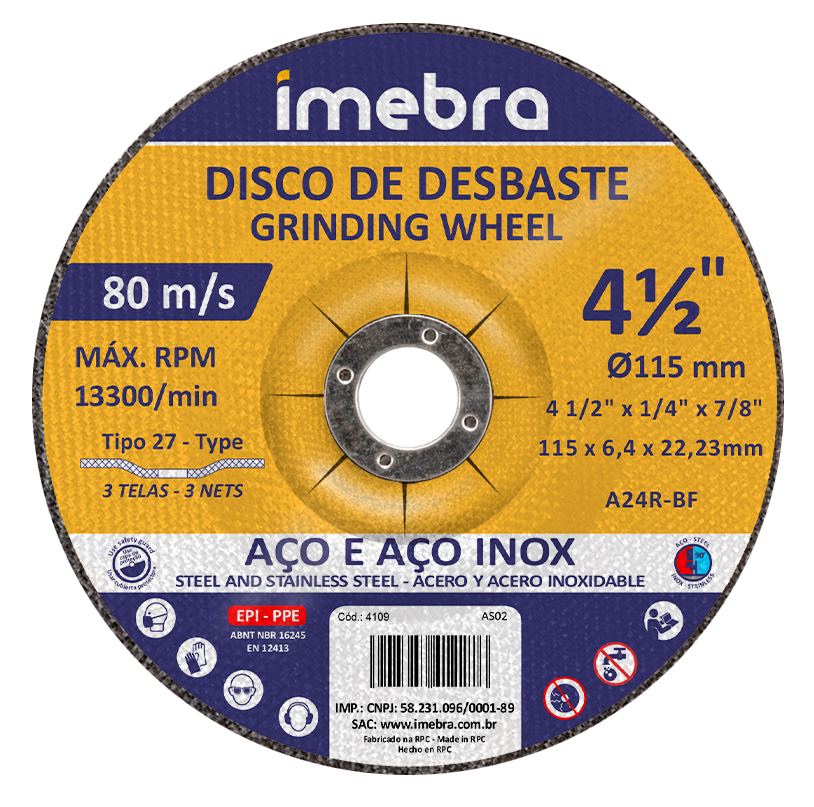 Detalhes: Disco de desbaste com abrasivo aglomerado com resina fenólica reforçada com telas de fibra de vidro.